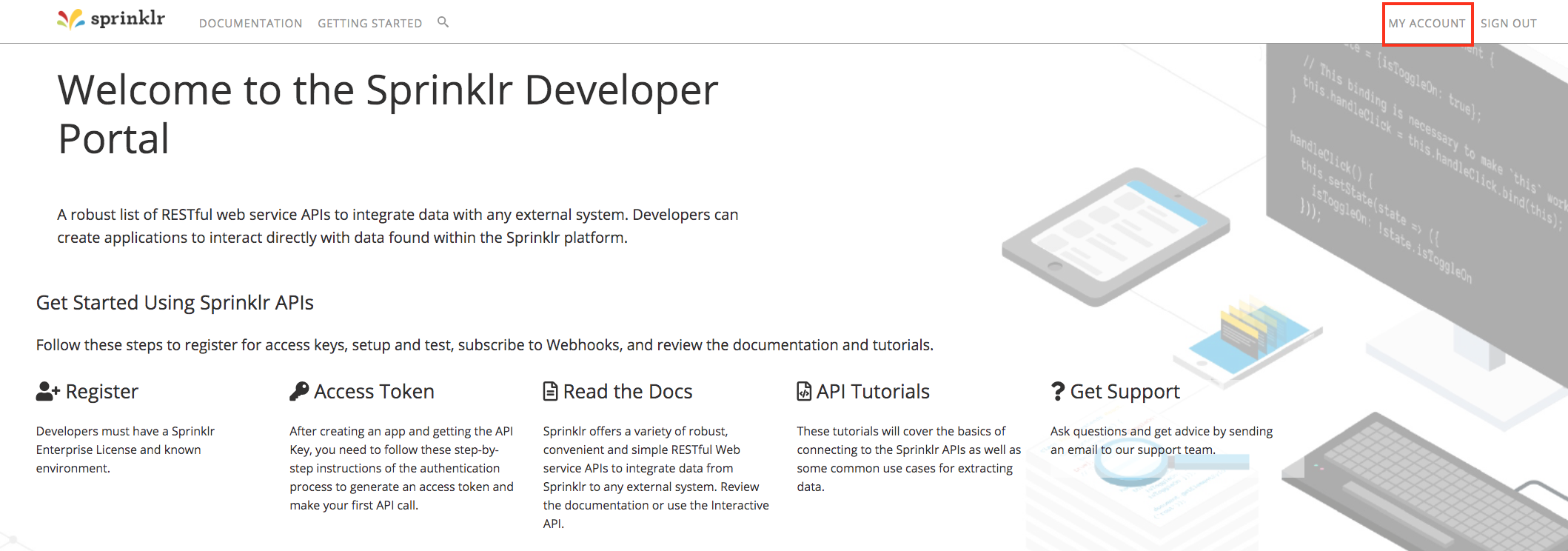 Go to https://developer.sprinklr.com/member/register and register a developer account by following the instructions in https://developer.sprinklr.com/docs/read/api_overview/Getting_Started.
