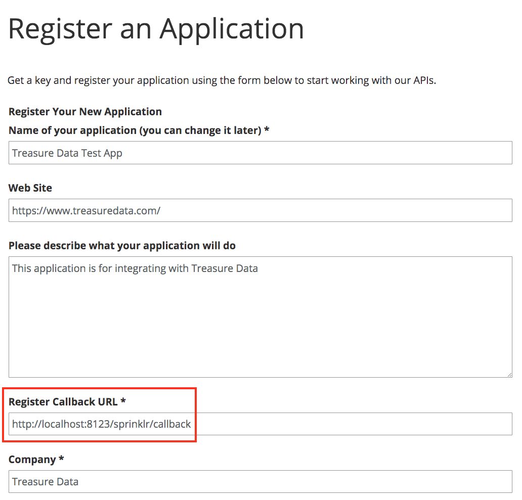 In Register Callback URL, we recommend using the values in the screenshot. http://localhost:8123/sprinklr/callback (value 2 of 7 required for this configuration) to simplify your token acquisition process.