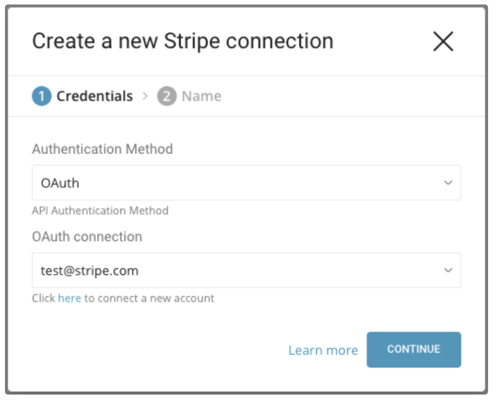Select an existing OAuth connection for Stripe, or select the link under OAuth connection to create a new one.