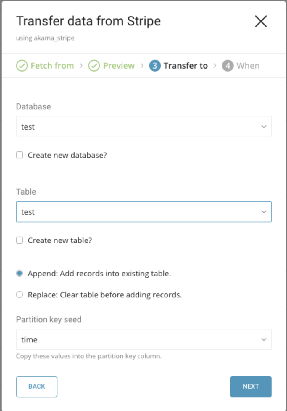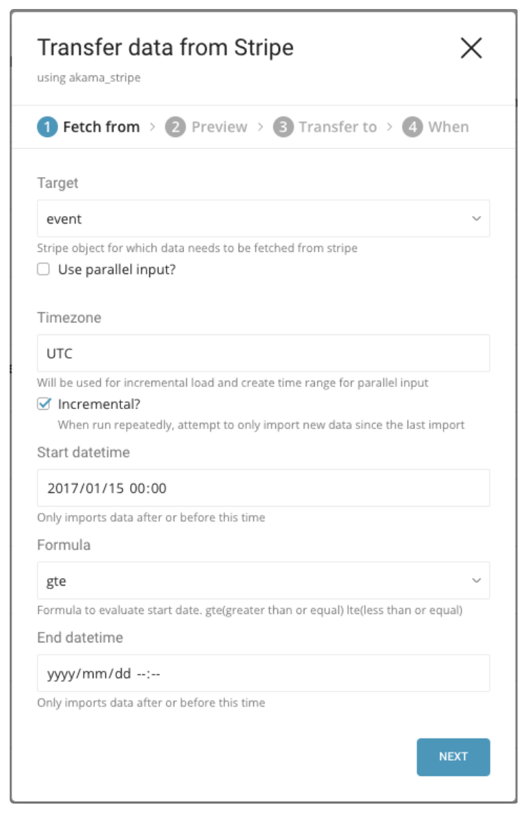 After creating the above connection, you will be automatically taken to My Connections tab. Look for the connection you created and select New Transfer. The incremental option is only supported for the event object.