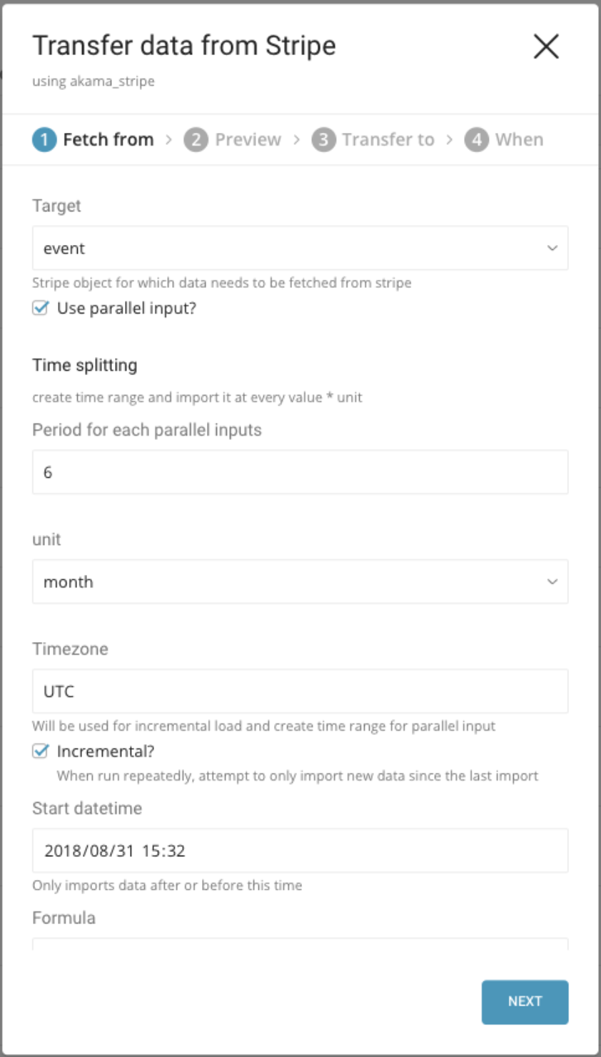 The plugin creates a time range that depends on Start datetime and End datetime and send parallel HTTP requests to Stripe API. If you don't edit the End datetime plugin tries to get the timestamp of the latest record stored in Stripe first and use it as End datetime.