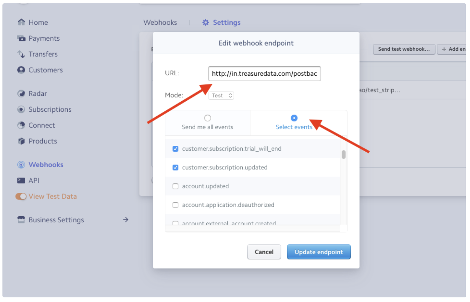 Login to Stripe account, select Webhooks —> Settings —> Add endpoint