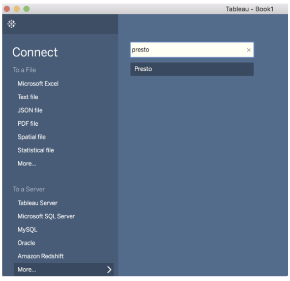 Select More on the left menu. Choose Presto and enter the connection information. Select Sign In.