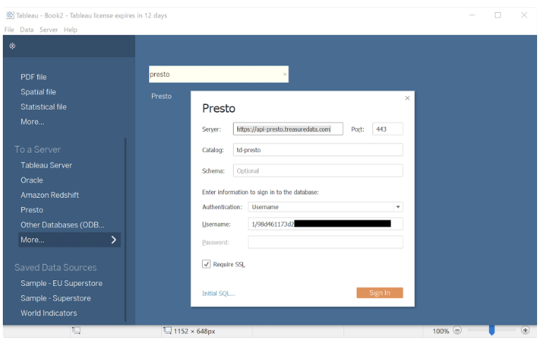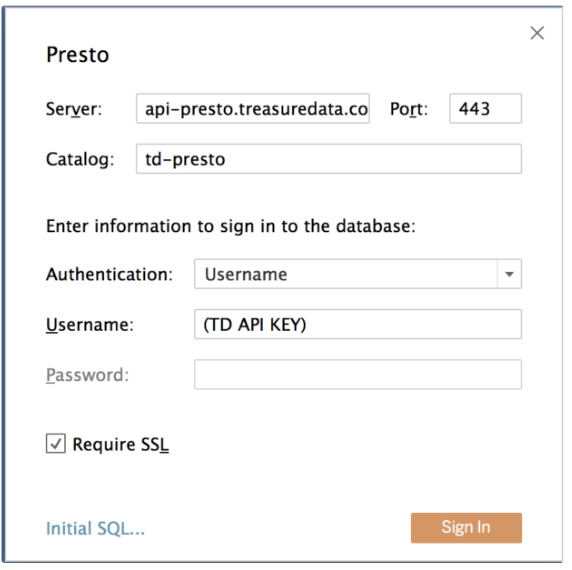 - Enter Presto JDBC Gateway server: api-presto.treasuredata.com