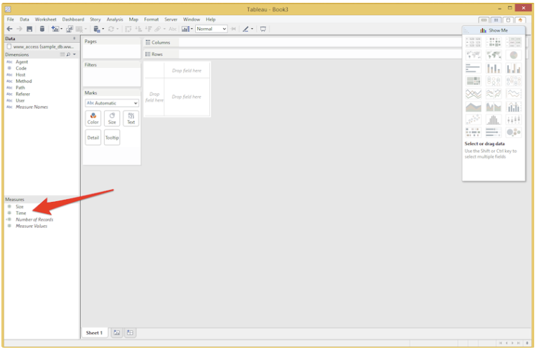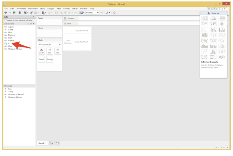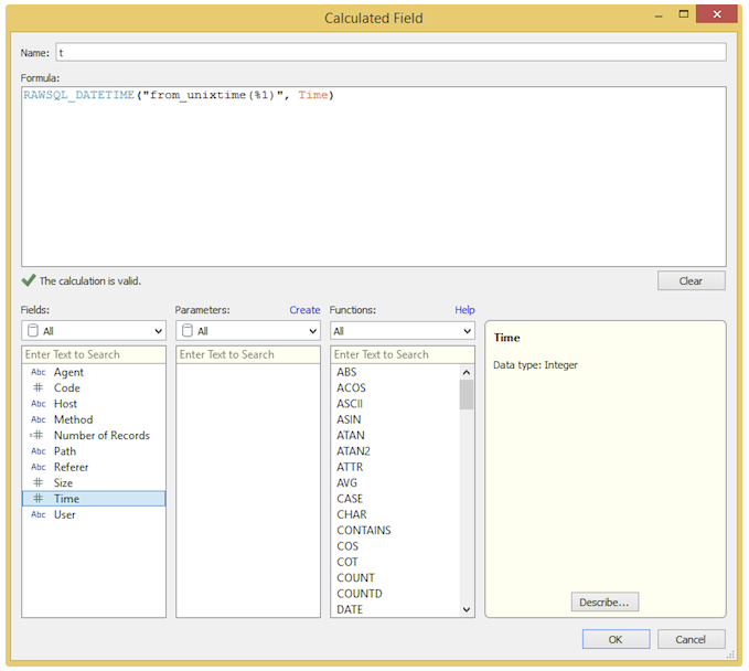 Treasure Data treats the time column as a UNIX timestamp by default, however, it’s really convenient to handle timestamp with Datetime type in Tableau. The following example describes how to create the calculated Datetime field for the “time” column.