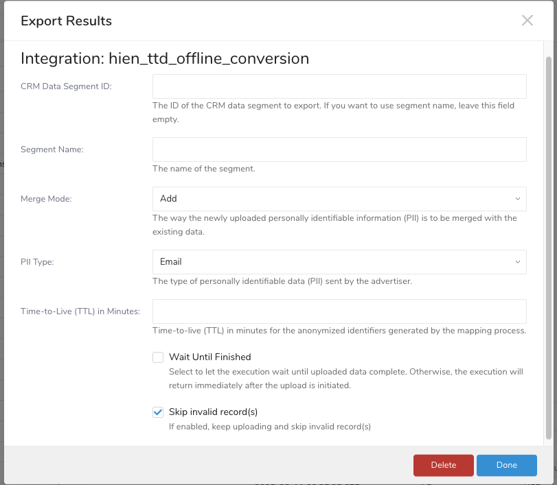 - CRM Data Segment ID(optional): Your CRM Data Segment ID. Required if Segment Name is empty.