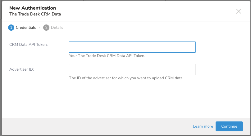 Edit the CRM Data Token and advertiser ID you obtained from The Trade Desk, and select Continue.