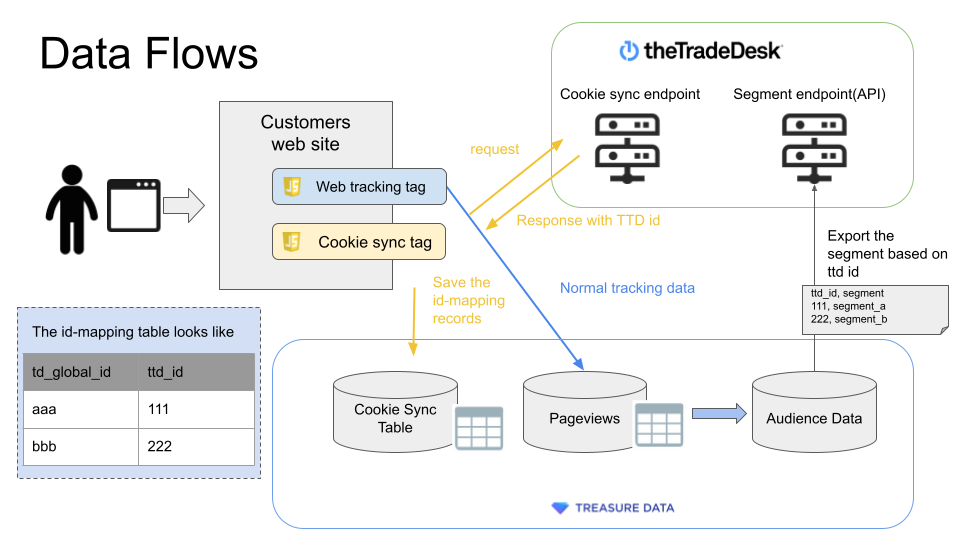 - Cookie-syncing between The Trade Desk DMP and Treasure Data CDP — This is required to create a mapping between The Trade Desk DMP ID and Treasure Data's ID td_global_id.