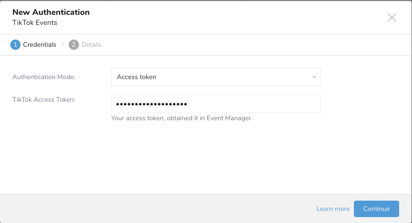 | access_token | TikTok access token generated from oauth flow or obtained from Events Manager. | N/A | N/A | Yes |