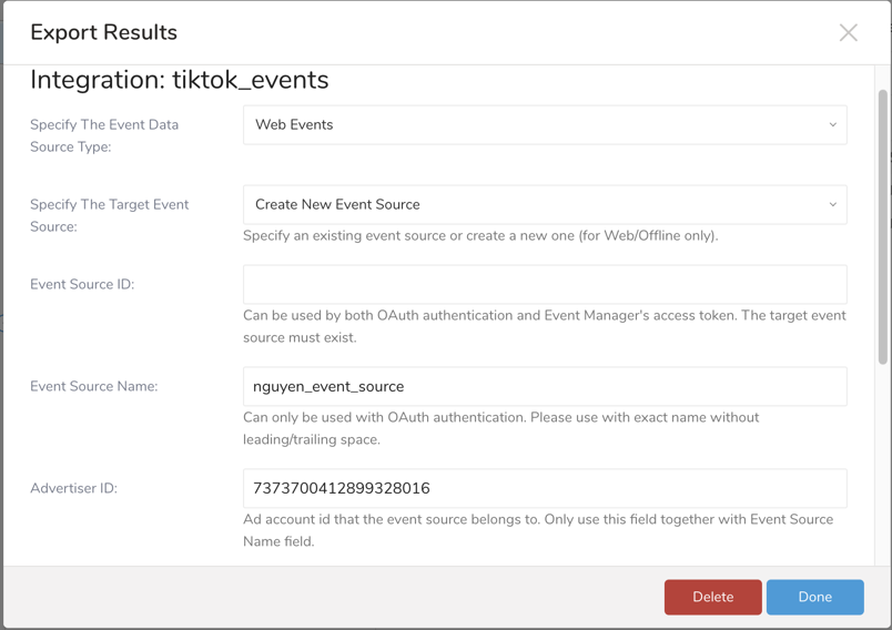 | type | Describe the name of the service as the destination of export. | tiktok_events | N/A | Yes |