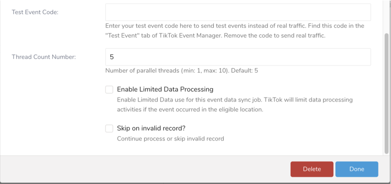 Field Description Test Event Code The TikTok Test Event Code for debug purposes. Thread Count Number Number of parallel requests to TikTok Events. Min: 1, Max: 10, Default: 5. Enabled Limited Data Processing The boolean value to enable/disable a limited data processing option. See Events API 2.0 - Limited Data Use for more details Skip on invalid record? The flag to continue or stop the job when the job handles an invalid record.