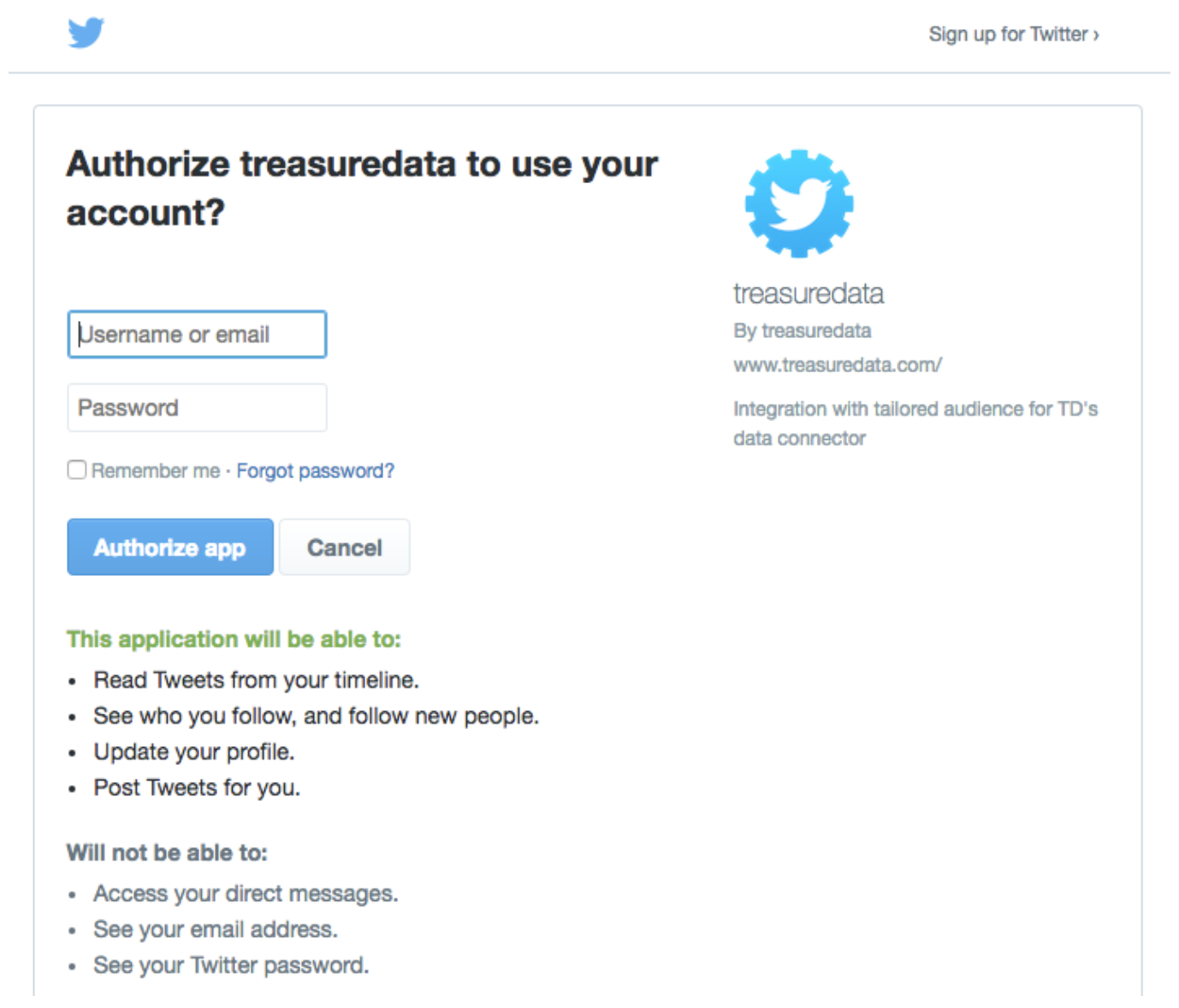 - Authorized Treasure Data Twitter app access to your Twitter Ads Account