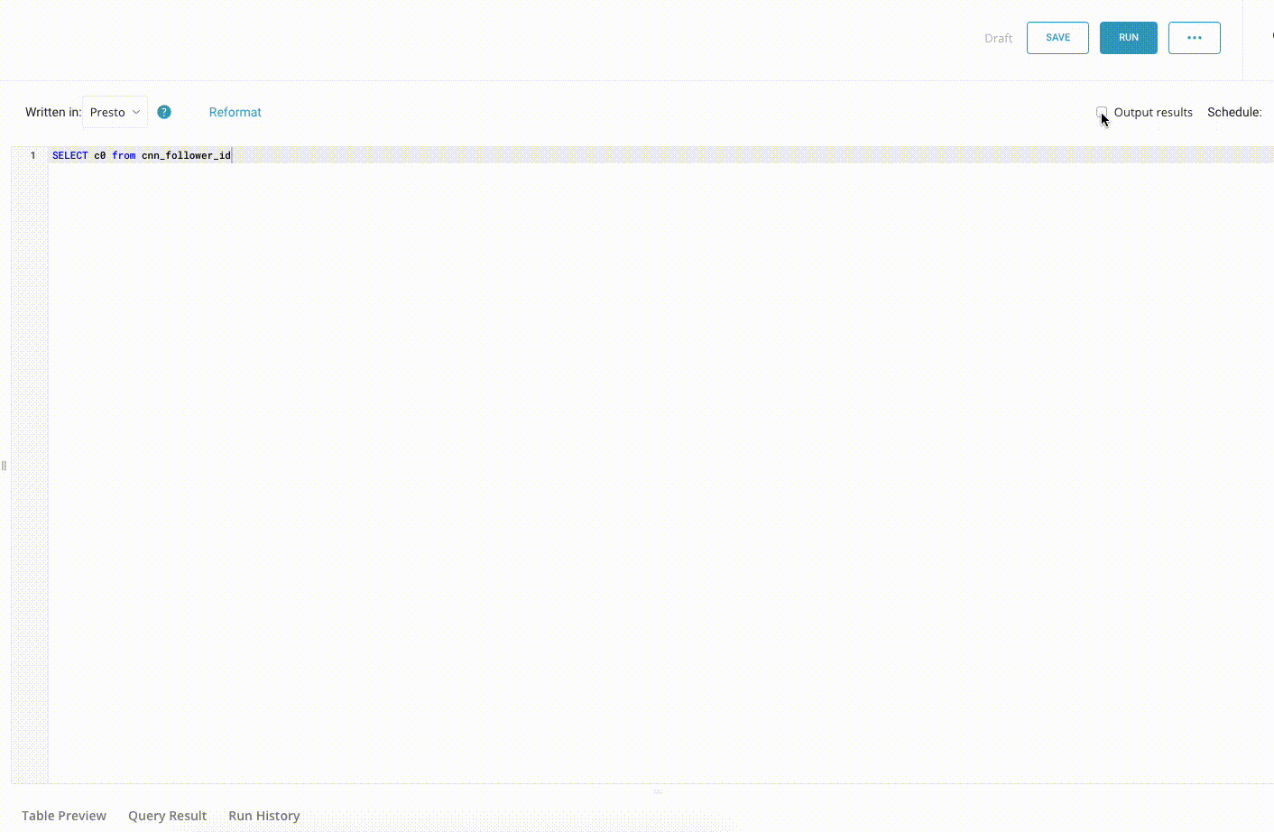 - Treasure Data supports the creation of a new Custom Audience list. On the Treasure Data console, run the following query with Output results into a connection of Twitter Custom Audience (see Appendix A for more details of column naming):