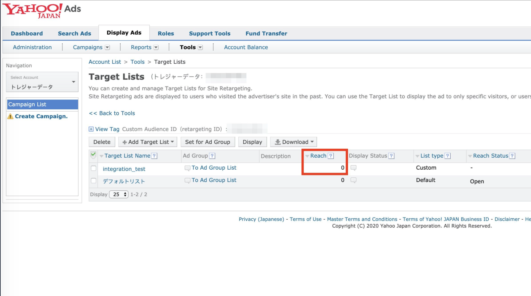 If the Reach number remains at zero and is not updated after the 3-4 hour processing period, you can check the processing status in Yahoo! JAPAN Ads to validate its status.