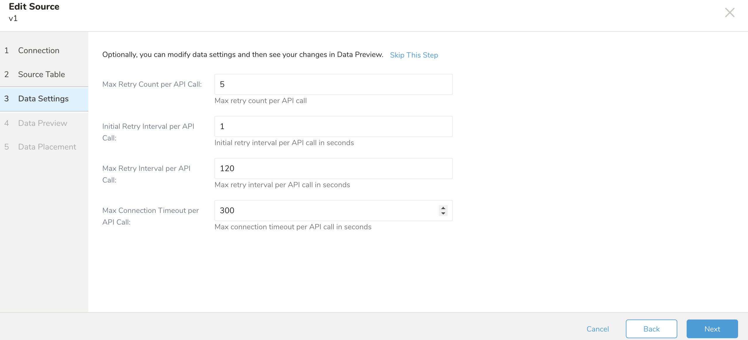 | Initial Retry Interval per API Call | In seconds, Default 1, min 1 ,max 300 |