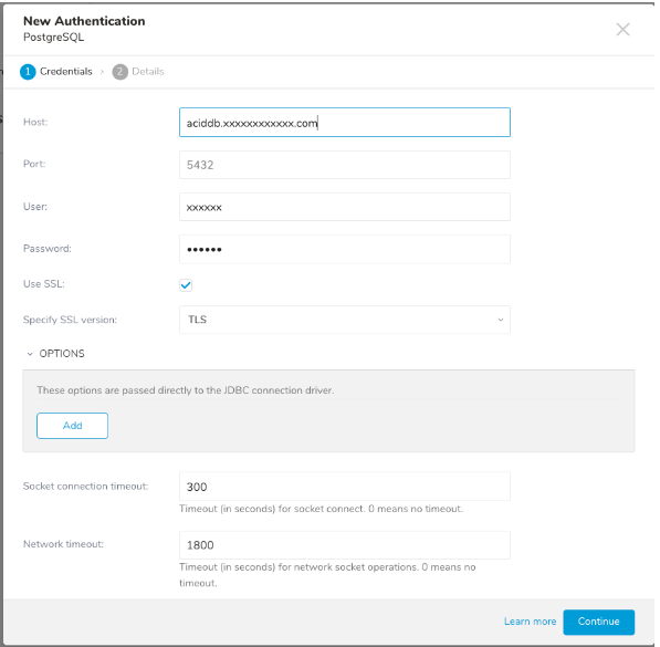 - In Authentications, enter the Data Tank 2.0 hostname, port, database name, username and password. 'Use SSL' option must be enabled.