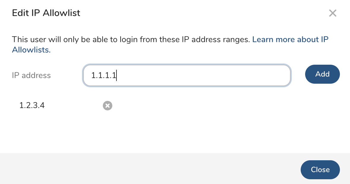As the Account Owner or an Administrator, you can make create or changes to the user account IP Allowlist. An Administrator can specify their own user IP Allowlist and the user IP allows a list of restricted users. An Administrator cannot modify the user IP Allowlist of another Administrator. The Account Owner can modify any IP Allowlist.
