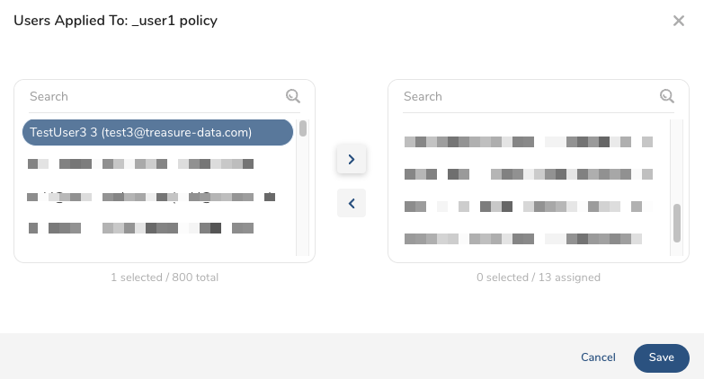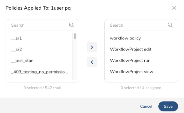 - Use the > and < buttons to add or remove policies applied to the user.