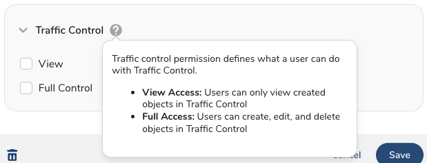 | Full Access | Users can create, edit, and delete objects in Traffic Control. |