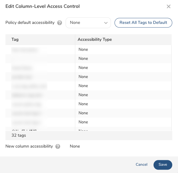 - Accessibility is assigned to a tag in the policy. This means that all columns that are annotated with the tag inherit the accessibility assigned to the tag. For example, if the PII tag is assigned with accessibility None, all columns tagged with the PII tag will have "None" as the accessibility for the user who is assigned with the policy.