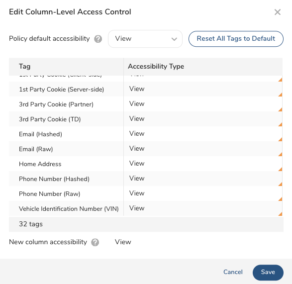 | Accessibility Type | Accessibility permission of none, view or masked per column tag. |