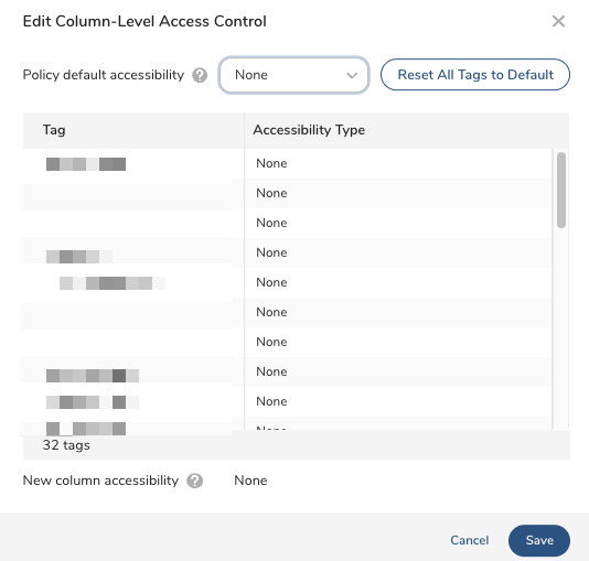 - No Access and Only Allow Access. For example, allow access to columns tagged with Finance , masked columns tagged with Sensitive , No Access to columns tagged with PII.