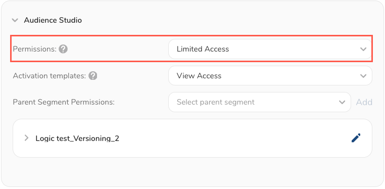 | Limited Access | Account owners and administrators can select a Parent Segment. From this view, they can drill down to lower panes that enable the selection of specific segment folders. Users only see Parent Segments for which they have permissions. Select the pencil icon to change the parent segment permissions, including the configuration, folder, and segment access levels. |