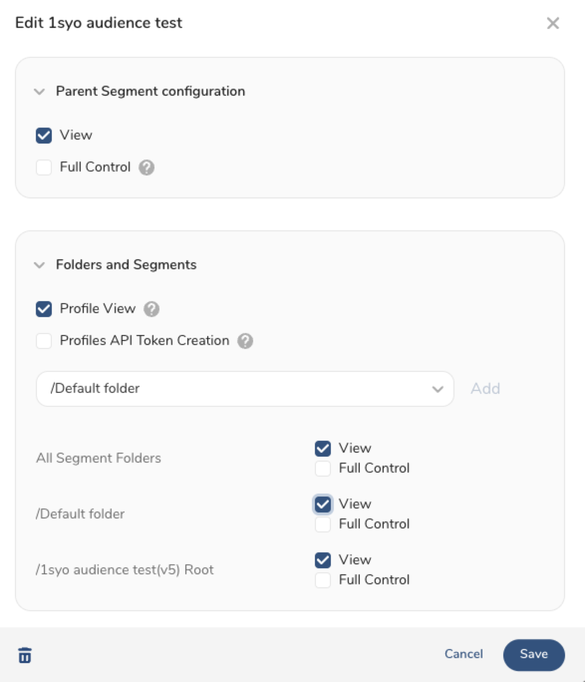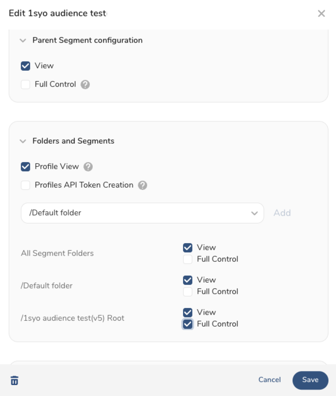 | Specific segment folders | Full Control | Users can view and edit specific segment folders within the specified parent segment. They cannot see profiles unless they have "Profile View" checked. Predictive scoring and API tokens associated with the segments are disabled.![]() |
