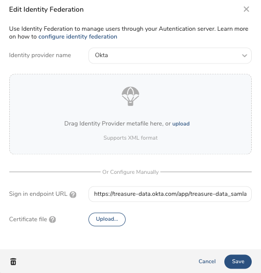 Though each Treasure Data account may have multiple IdPs, each IdP must be configured separately.