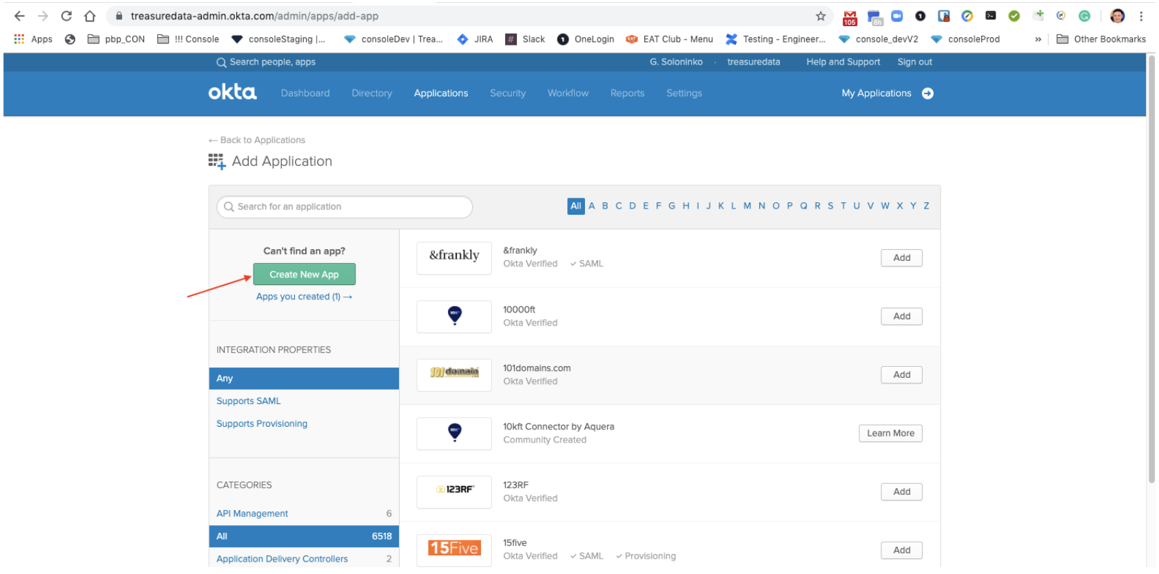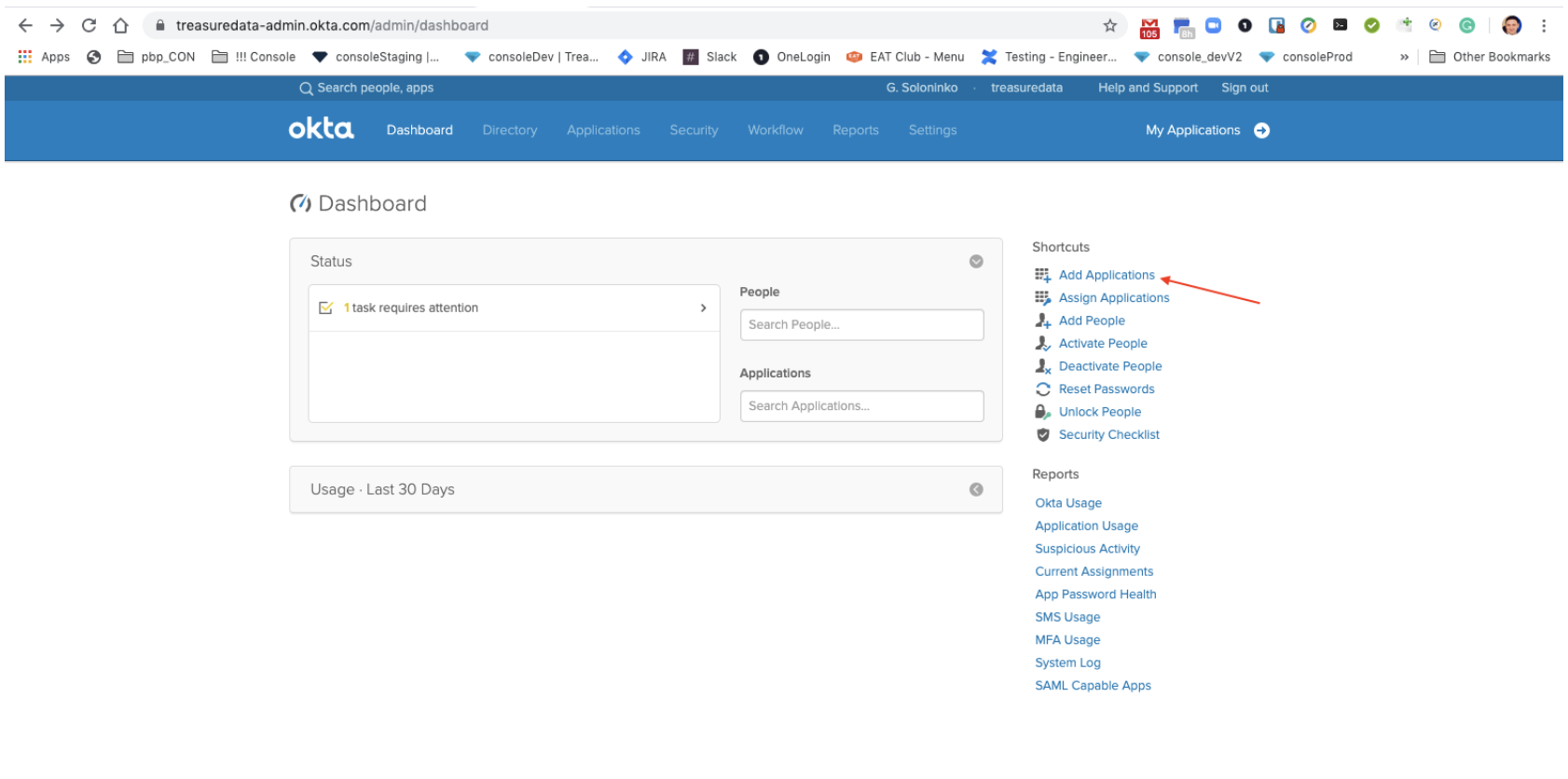In the IdP environment, you must add Treasure Data to your list of authorized applications. Each Treasure Data account is added as a separate application and users are assigned to the Treasure Data applications in Okta.