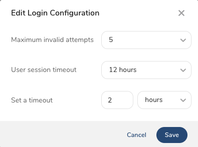 Administrators can specify the maximum times that users can attempt to login and specify the length of time a logged-in user can stay logged in without their session timing out.