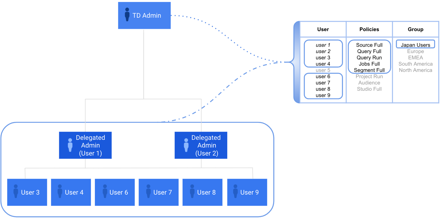 TD Admins can create Delegated Groups and set up regional teams to manage data within the global platform. They can choose policies available to the group members and assign one or more Delegated Admins for the group. In the following example a TD Admin has created a Delegated Group for Japan Users who have access to a specific set of policies. The group has two Delegated Admins selected to oversee the group and apply or restrict policies.