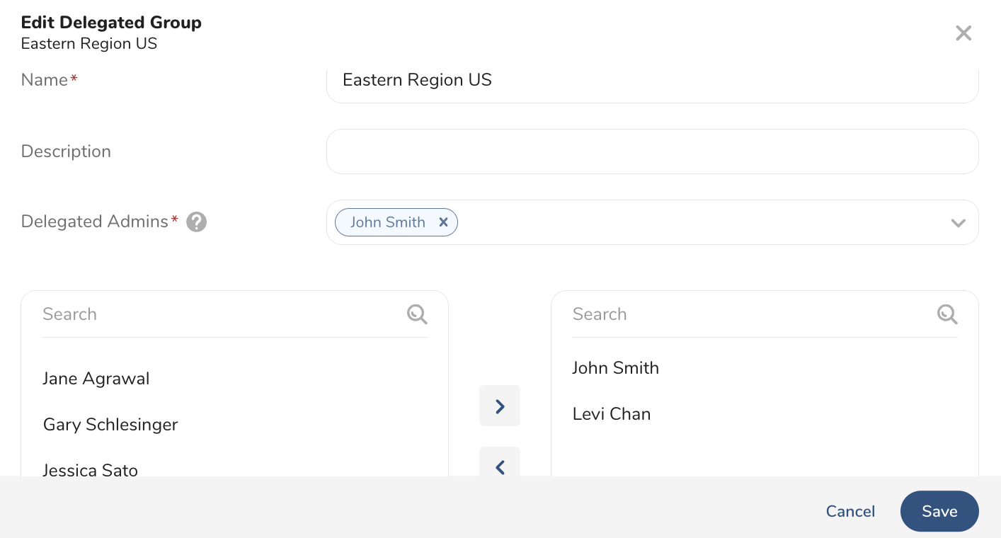 A Delegated Group must have a delegated admin assigned when the group is created. Delegated Admins which are removed from their role remain in the group and must be replaced with a new admin in order to save.