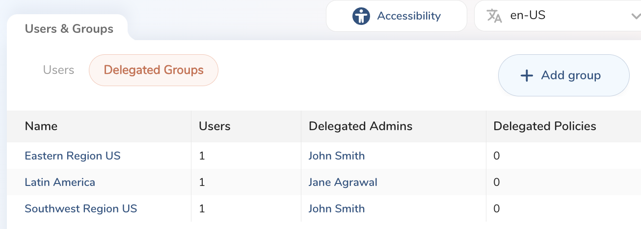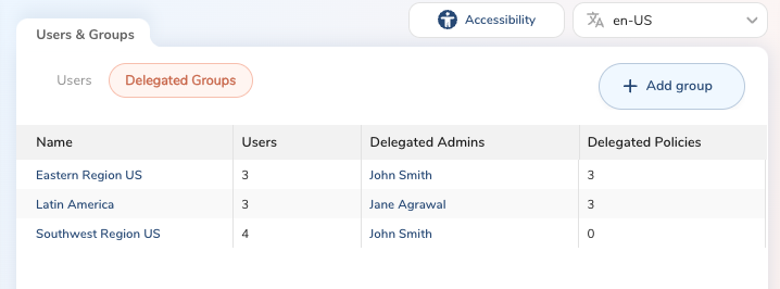 - In the modal that opens, type the name of new Delegated Group and choose a Delegated Admin to oversee the group. Optionally, add a description for your new group and additional users at this time. A delegated group may have more than one delegated admin.