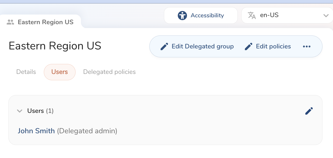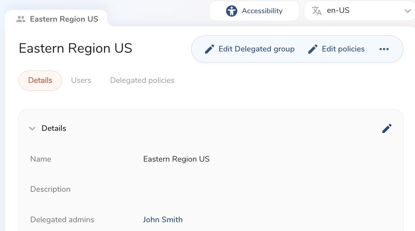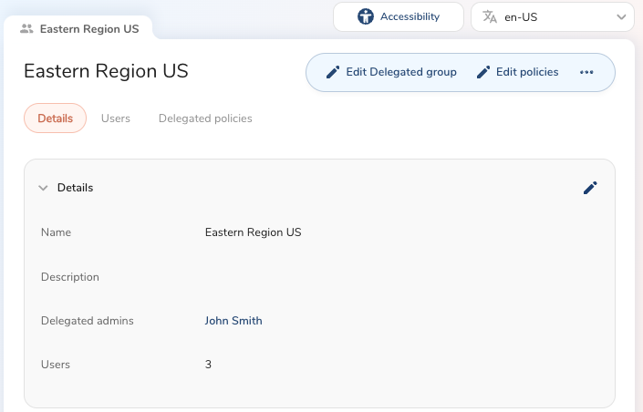- Select Edit Delegated group or select the pencil icon from the Details tab in modal.