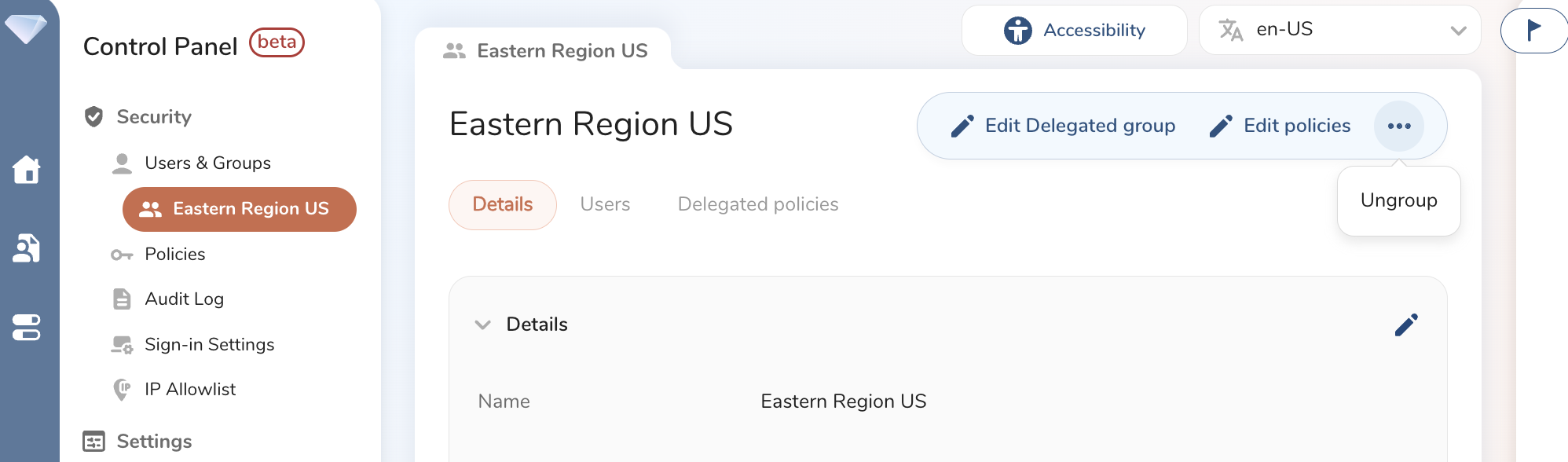- A dialogue opens confirming you want to ungroup the delegated group. All policies and users created within the delegated group remain. **