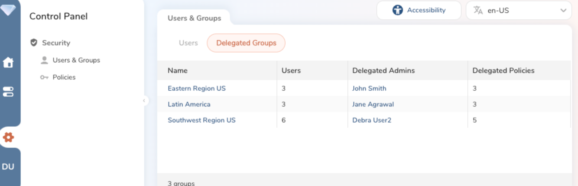 Delegated Admins oversee a particular region and its associated policies and users. Delegated Admins can view group membership and assign the policies members can access.