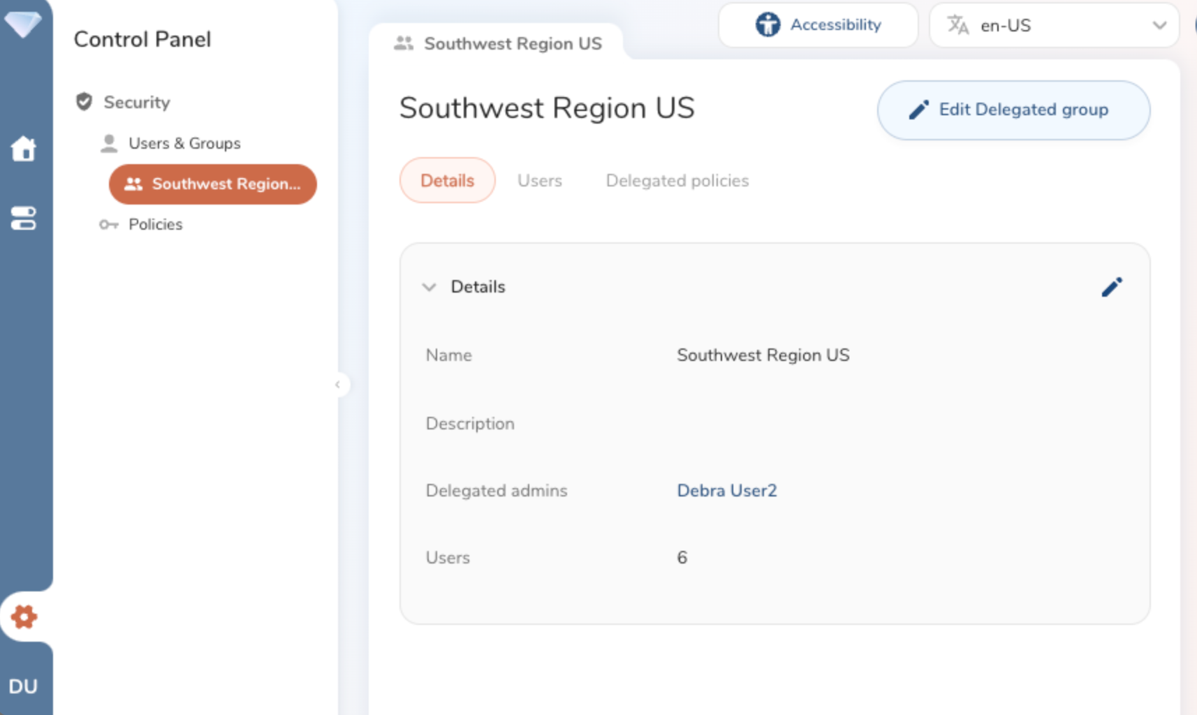 - In the information panel, you can view details for the Delegated Group, the Users, and the Delegated Policies assigned to the group.