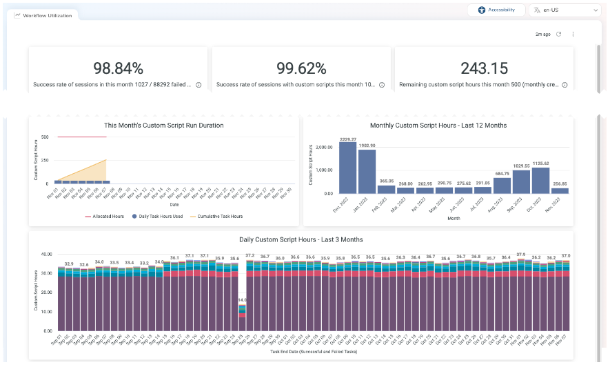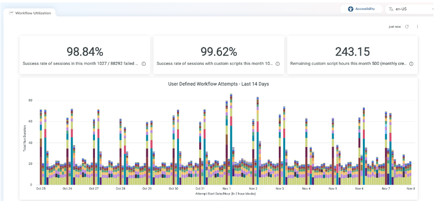 The following chart is an example of the Workflow Utilization Dashboard, which includes this month’s success rate of sessions and the success rate of sessions with custom scripts. It also shows this month’s remaining custom script hours and user-defined workflow attempts over the last 14 days.