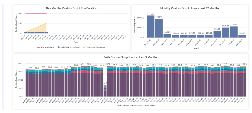 These charts show the current month’s script duration and custom script hours for the previous year as well as the daily custom script hours.