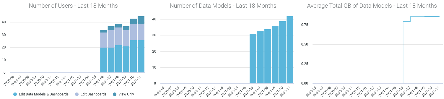 The dashboard provides an overview of user and data model statistics, a detailed count of users and their roles with data model details, and a historical record of usage.