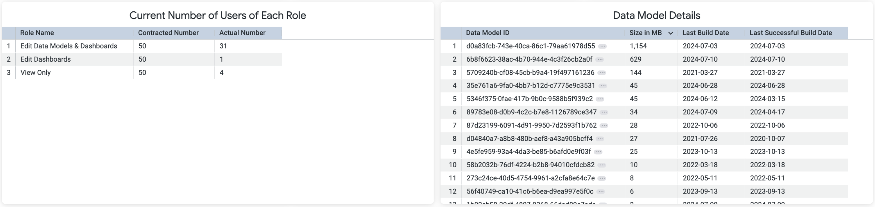 This tile provides a quick review of the number of users, data models, and the total consumption size of data models currently running.