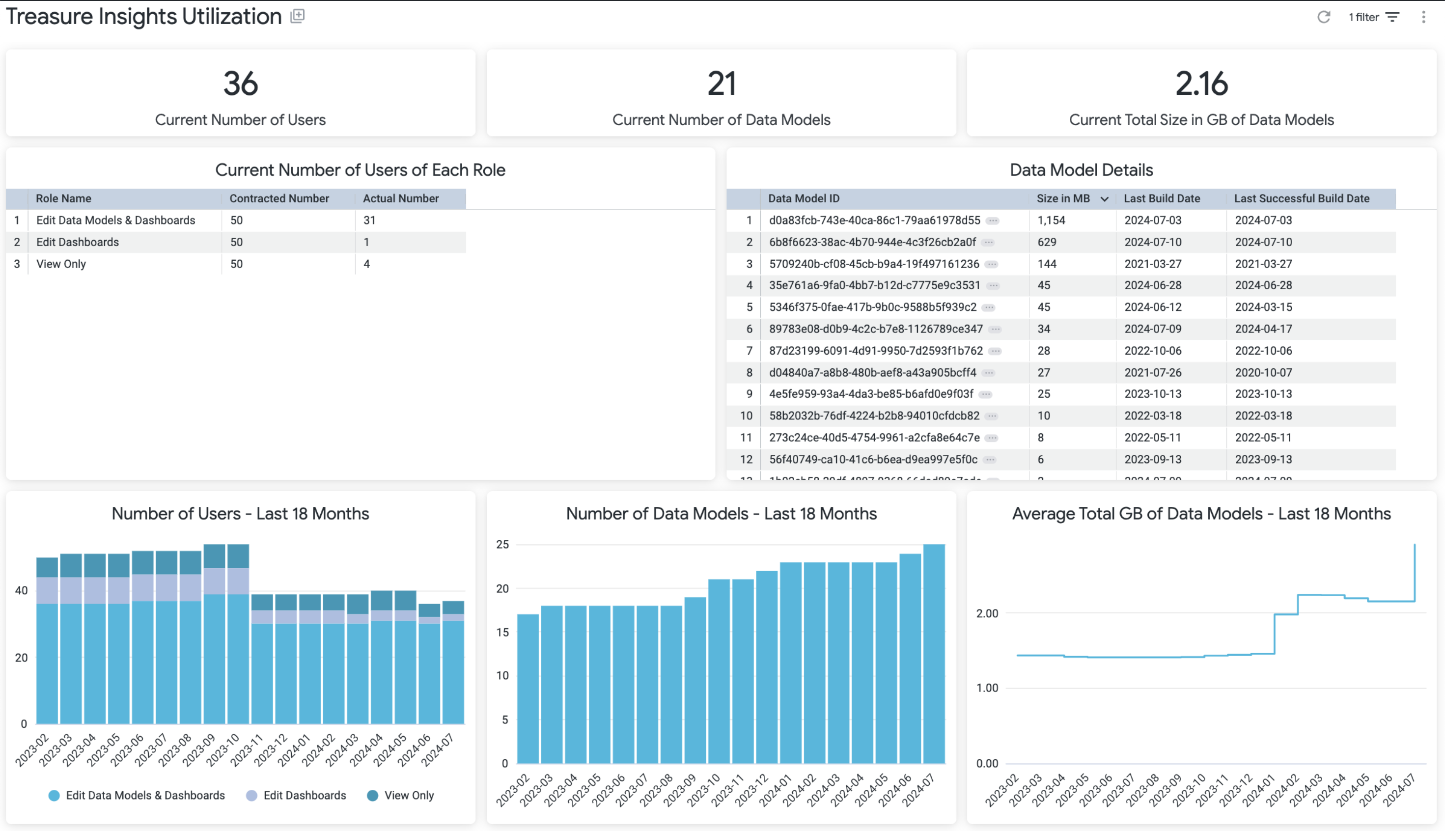 Use this tile to review the number of users in each Treasure Insights role and detailed information for each data model.