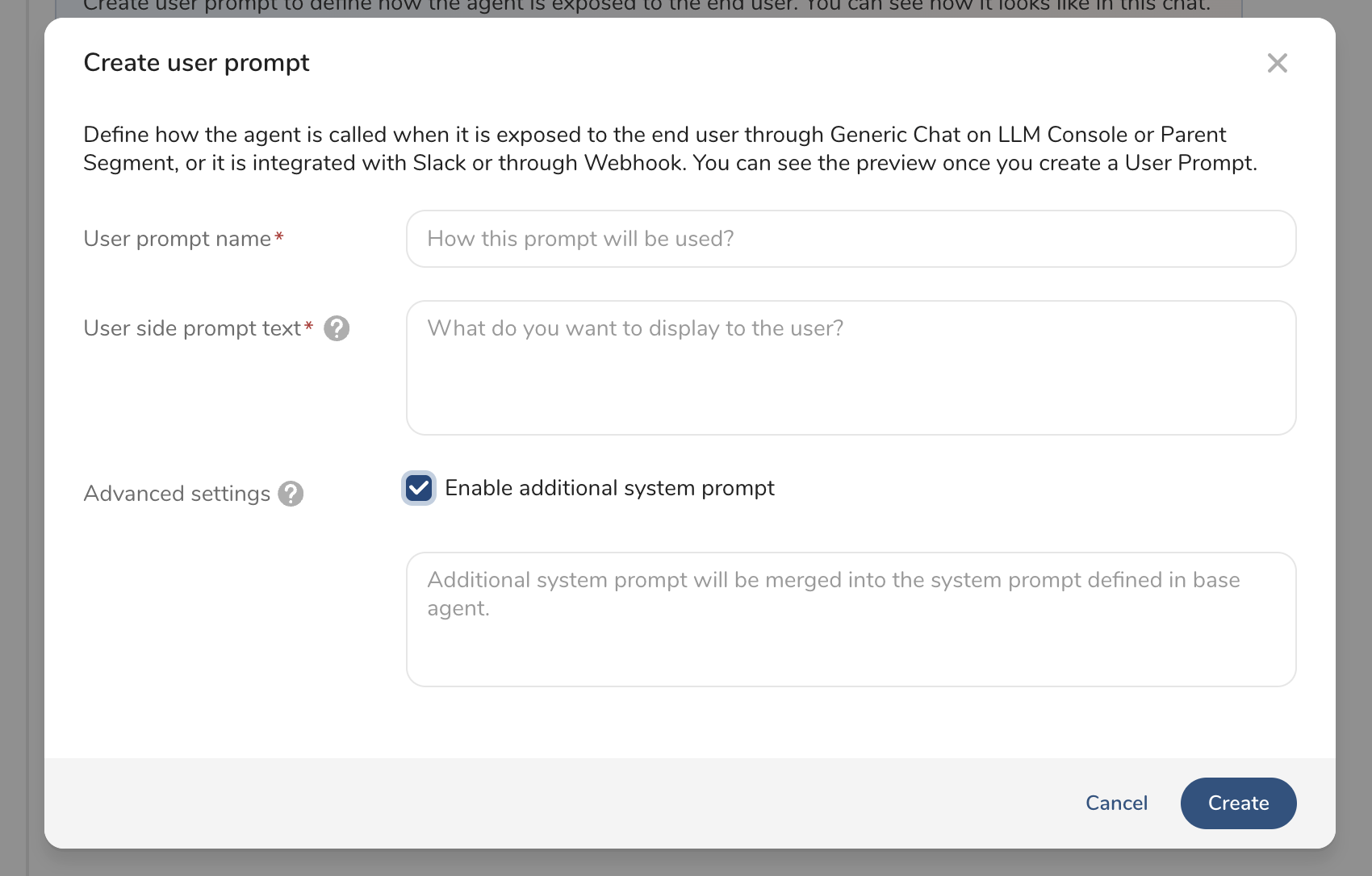 A user prompt is the method to define the first user input to the agent. When you make your agent available via any integration, you must define a user prompt. A user prompt is a unit that exposes an agent to users.
