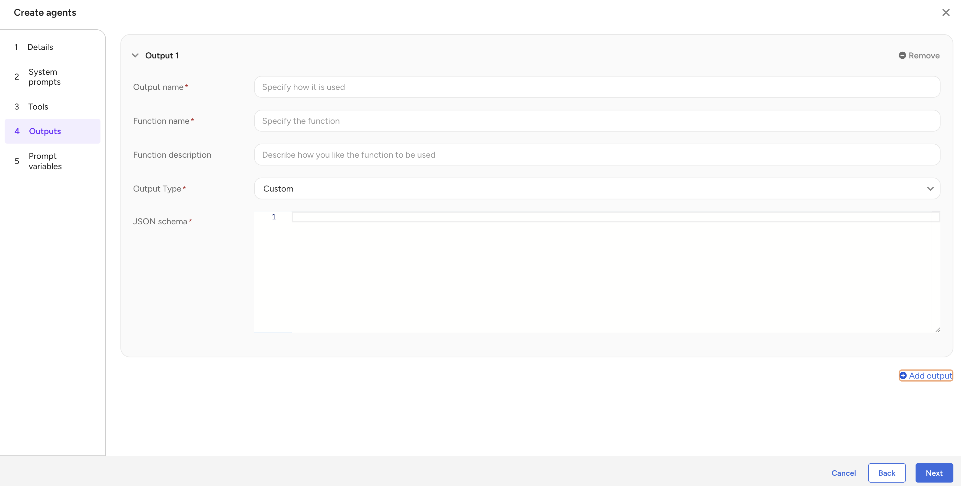 | JSON Schema (for Custom) | Provide the JSON schema for the output data structure. The agent creates output following this definition. |