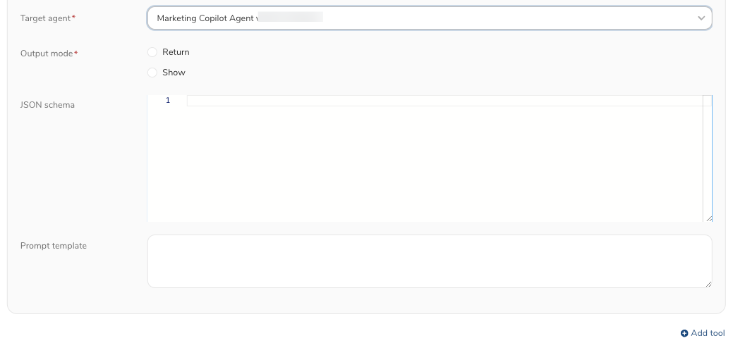 - Prompt template: A user prompt that is used when the target agent is called. This can utilize paramter with "{{parameter_name}}" format. parameter_name must be defined in the JSON schema