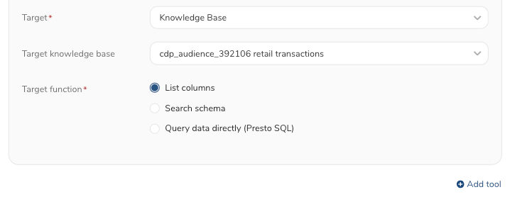 - Function Description : (Optional) Enter a function description—for example, list the available tables and columns. LLM sees the description. LLM can choose approproate tool if the detailed description is defined.