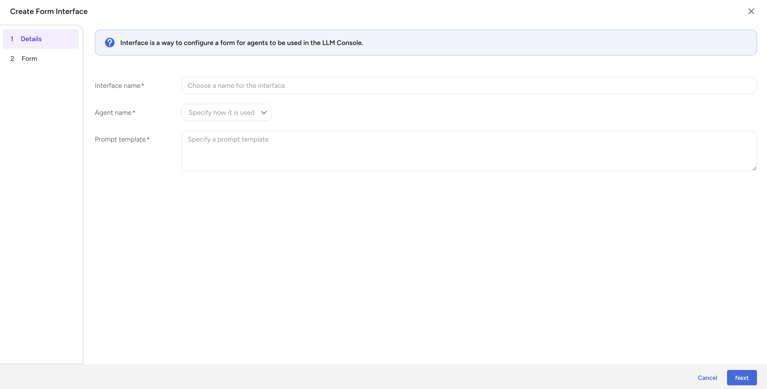 An interface object is the configuration or the screen for agent that will be shown in the Workspace. Once this object is created, underlying agent will be appeared in the Workspace with defined interface. Currently, Interface definition supports only a Form-type.