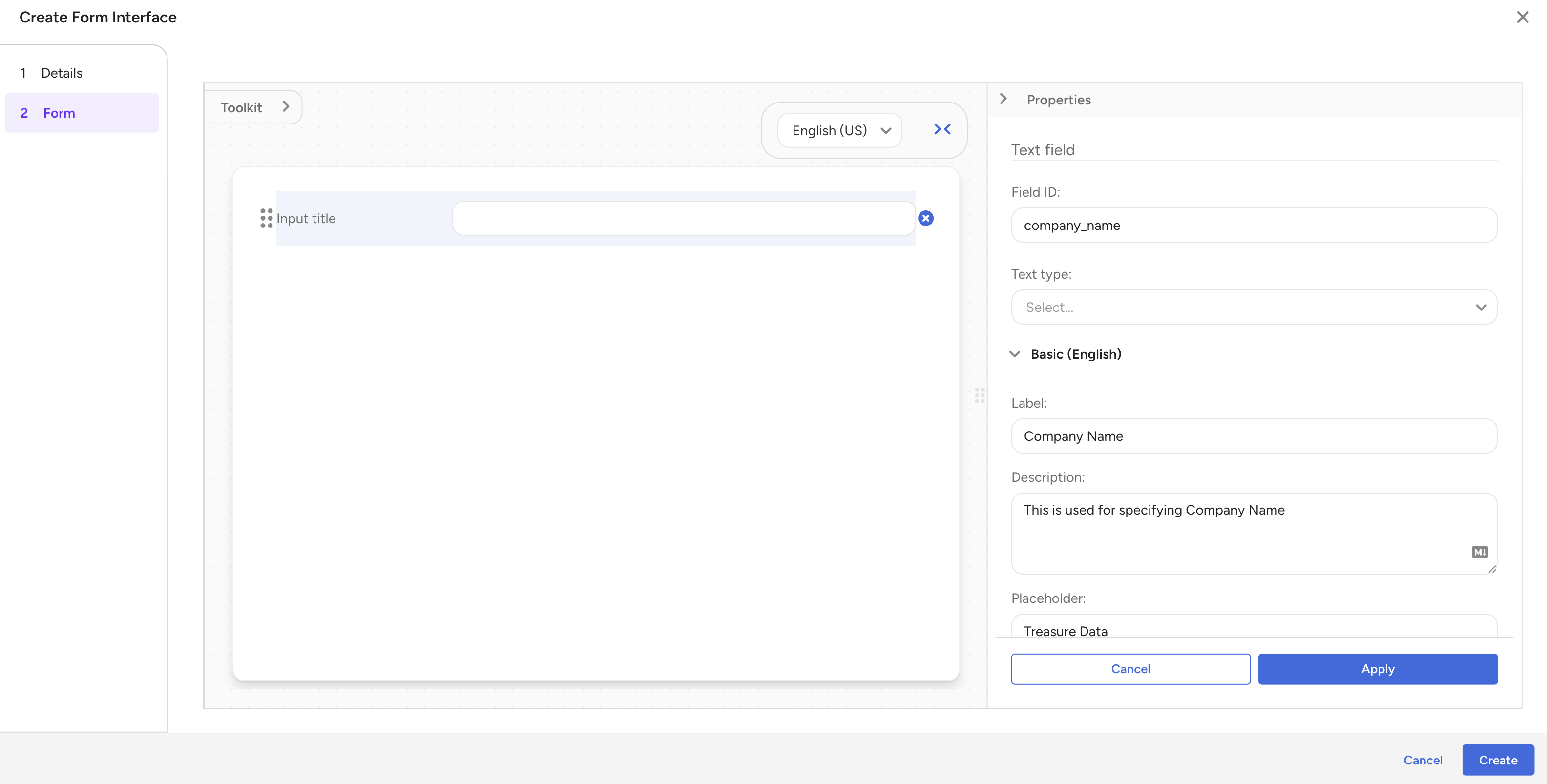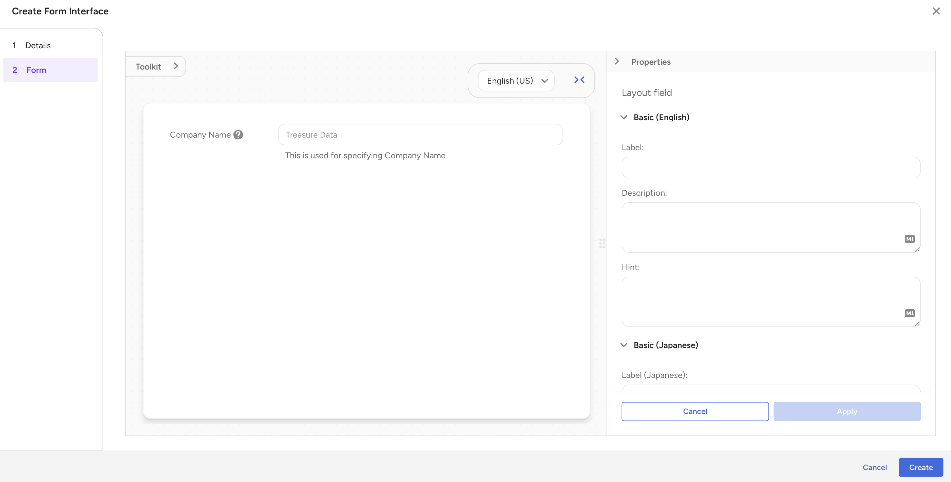Form item has its own configuration. Not all configurations need to be set up, except for the Field ID , which is a variable name for this form item and must be referred to by the Prompt template. Also the form item has configuration both for English and Japanese. Japanese configuration is used when the Japanese language is selected on the TD Console.