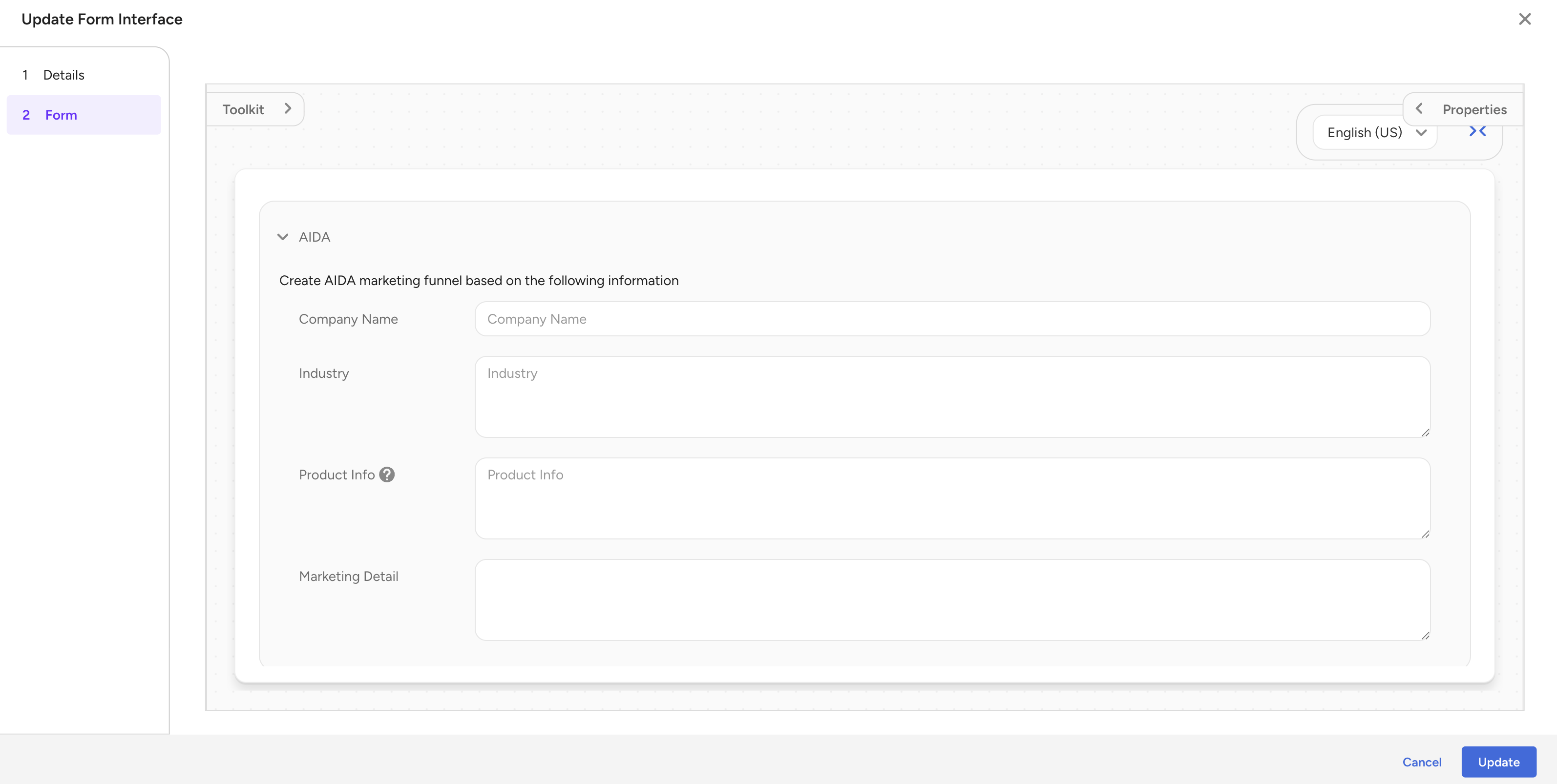 Below is the example prompt template and form definition for an agent that generates an AIDA marketing funnel. The agent is assumed to generate text output based on the information of Company Name, Industry, Product, and Marketing Detail.